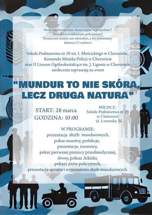 Mundurowi z Chorzowa serdecznie zapraszają wszystkich zainteresowanych wstąpieniem w policyjne szeregi na wydarzenie pod nazwą „Mundur to nie skóra, lecz druga natura”. Spotkanie odbędzie się 28 marca o godzinie 10:00 w Szkole Podstawowej nr 29 przy ul. Lwowskiej w Chorzowie.
