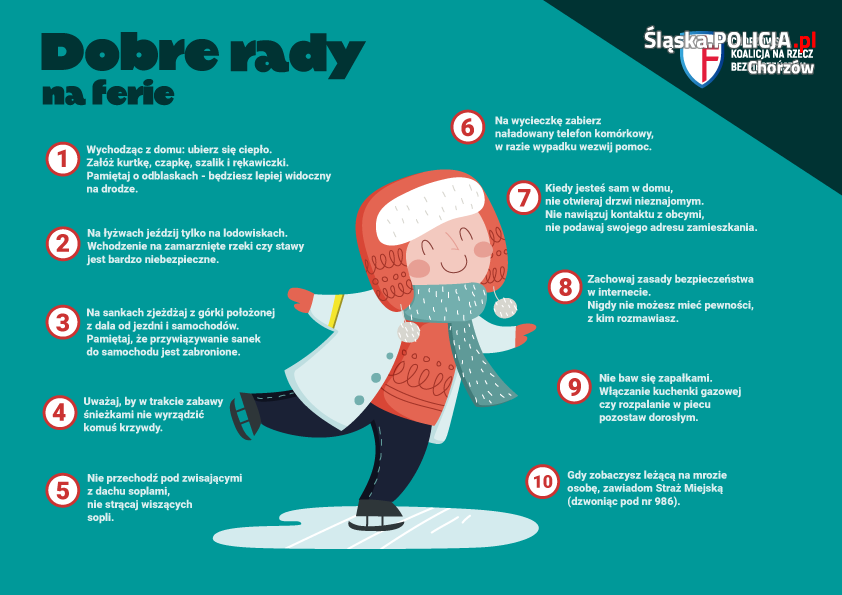 Dzieciom pozostającym w domu przypomniał o konieczności zamykania drzwi na klucz i o zakazie wpuszczania do domu osób nieznajomych. Uczulił, aby nie bawić się ogniem, prądem i wodą, a korzystając z internetu nie podawać swoich danych, nie wysyłać zdjęć i nie opowiadać nowym znajomym z sieci o zasobności rodziców. Przestrzegał, żeby w czasie zabaw na śniegu nie zjeżdżać na sankach w miejscach położonych blisko drogi lub zbiorników wodnych, nie dopinać sanek do samochodów, na łyżwach jeździć tylko na wyznaczonych lodowiskach, a jeżdżąc na nartach wybierać stoki dostosowane do własnych umiejętności.