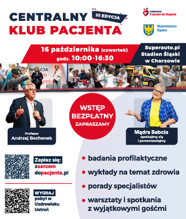 Już 16 października (czwartek) w godz. 10.00–16.30 na Superauto.pl Stadionie Śląskim w Chorzowie odbędzie się trzecia edycja Centralnego Klubu Pacjenta. Wstęp jest bezpłatny (zapisy: www.zsercemdopacjenta.pl), a na uczestników czeka różnorodny program skierowany do osób w każdym wieku. Współorganizatorem tegorocznej edycji jest Marszałek Województwa Śląskiego, Wojciech Saługa.