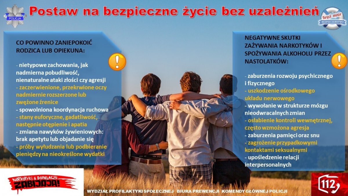 Okres letni i wakacje oraz związane z tym dużo wolnego czasu często wiąże się z eksperymentowaniem przez dzieci i młodzież z różnymi substancjami psychoaktywnymi, w tym alkoholem i środkami odurzającymi, a także tzw. nowymi narkotykami. Sprzyja temu mniejsza kontrola osób dorosłych, większa swoboda młodych ludzi, a także często negatywny wpływ grupy rówieśniczej. Podczas spędzania wolnego czasu, ale i na co dzień... niech kręci nas bezpieczne życie bez uzależnień!