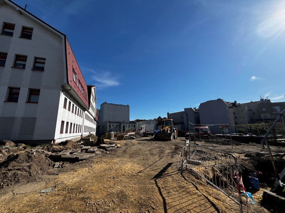 Za szpitalem dziecięcym przy ul. Truchana mamy plac budowy z prawdziwego zdarzenia! Trwają intensywne prace nad budową budynku poradni specjalistycznych.