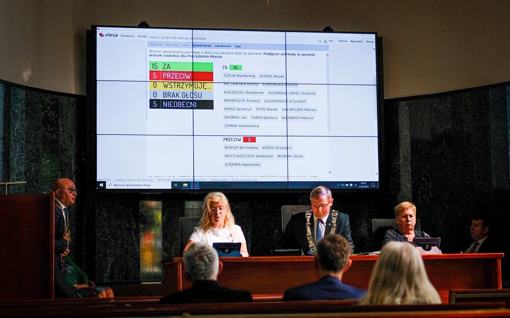W głosowaniach za udzieleniem prezydentowi absolutorium oraz wotum zaufania opowiedziało się 15 radnych, a 5 było przeciw.