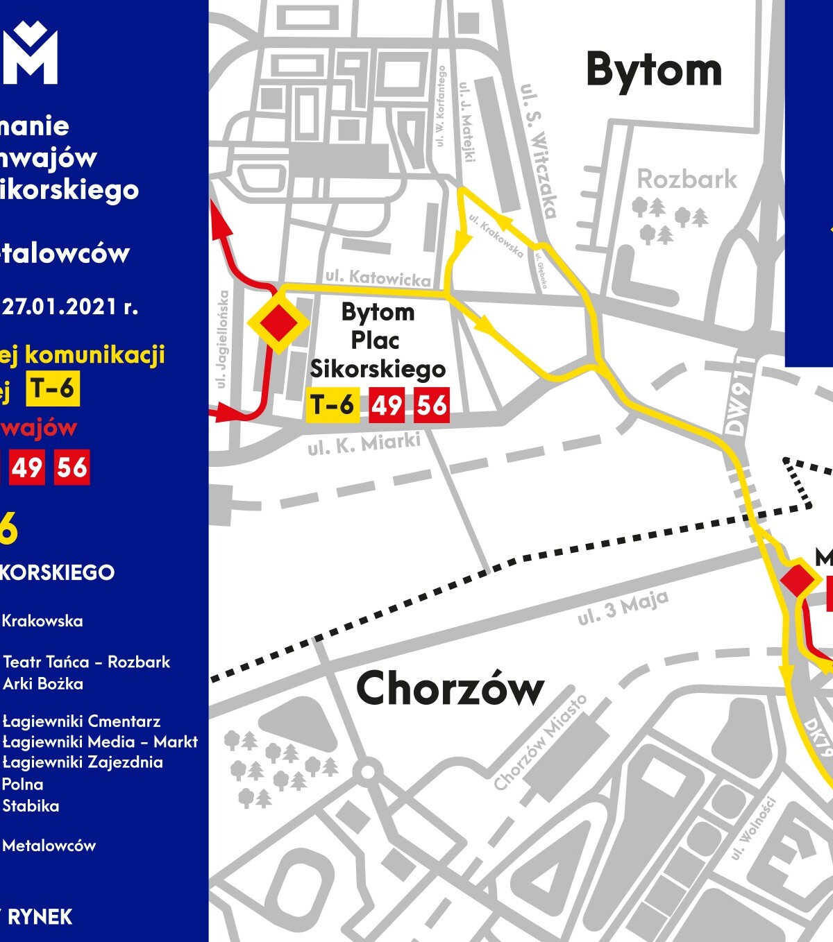 - uruchomiona zostanie przez ZTM autobusowa komunikacja zastępcza, oznaczona jako T-6, kursując w relacji: Bytom pl. Sikorskiego – Chorzów Rynek.