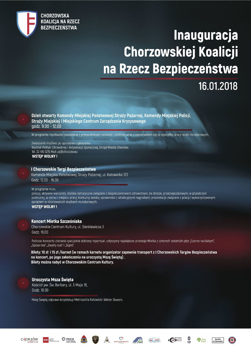 W ramach inauguracji przewidziano szereg wydarzeń. I tak od godziny 9 do 12 będzie można zwiedzić z przewodnikiem Komendy: Miejskiej Państwowej Straży Pożarnej, Miejskiej Policji, Straży Miejskiej oraz Miejskie Centrum Zarządzania Kryzysowego. W godzinach od 12 do 16 odbędą się I Chorzowskie Targi Bezpieczeństwa, w programie których znalazły się między innymi pokazy, warsztaty i konkursy. Z kolei na godzinę 16 w Chorzowskim Centrum Kultury zaplanowano Koncert Mietka Szcześniaka, podczas którego usłyszymy największe przeboje z czterech ostatnich płyt artysty: „Czarno na białym”, „Spoza nas”, „Zwykły cud” i "Signs". Zwieńczeniem dnia będzie uroczysta msza święta w kościele pod wezwaniem Św. Barbary, którą odprawi metropolita katowicki, arcybiskup Wiktor Skworc.