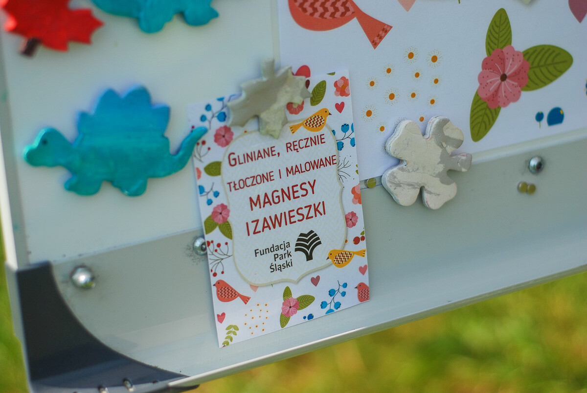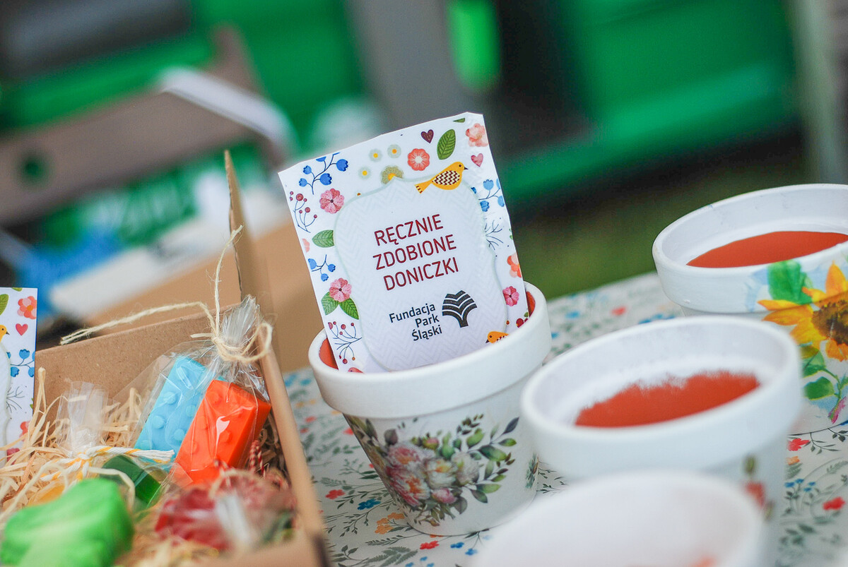 Na miejscu w oczy rzuca się także kolorowe stoisko Fundacji Park Śląski, gdzie znajdziemy sporo rękodzieła: doniczki, torby, ozdoby, których zakup zasili kasę instytucji.