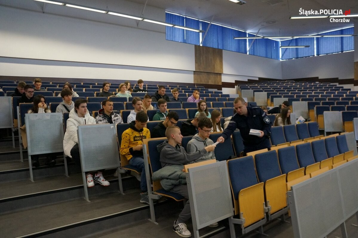 W ubiegły piątek chorzowscy policjanci zajmujący się profilaktyką społeczną przeprowadzili zajęcia z ukraińską młodzieżą. W spotkaniu, które odbyło się w chorzowskim oddziale Wyższej Szkoły Bankowej, wzięło udział niespełna 40 osób. W trakcie prelekcji mundurowi omówili tematykę bezpieczeństwa obywateli Ukrainy przebywających na terenie Polski. Przekazali informacje dotyczące instytucji służących społeczeństwu, które są przeznaczone do ochrony bezpieczeństwa ludzi i mienia. Przybliżyli także podstawowe przepisy prawa obowiązującego na terenie Polski. Była to okazja do omówienia tematyki handlu ludźmi, a przede wszystkim wyjaśnienia, w jaki sposób może się przejawiać. Chorzowscy policjanci wyjaśnili też zagadnienia związane z pojęciem hejtu i mowy nienawiści. Podczas spotkania padło wiele pytań ze strony uczestników. Dotyczyły m.in. dokumentów uprawniających do pobytu na terenie Polski, czy też pracy Policji i jej uprawnień do legitymowania. Na koniec młodzież otrzymała broszury informacyjne dotyczące omawianych zagadnień w języku polskim i ukraińskim.