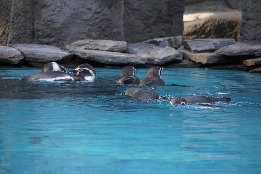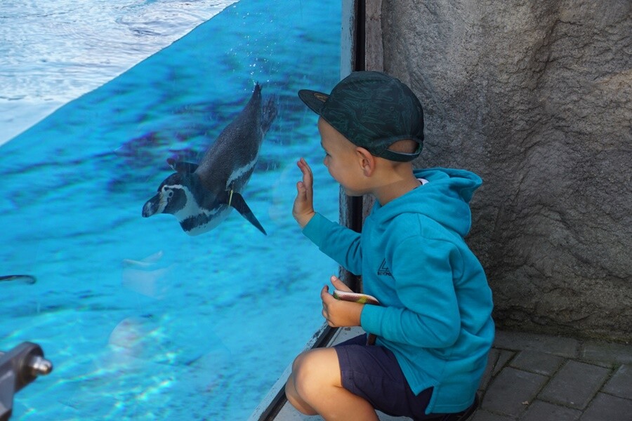 Goście ZOO mogą obserwować pingwiny pośród skał i zakamarków oraz pod wodą. Wystarczy zejść po schodach w miejsce, gdzie przez szybę można oglądać pływające w basenie ptaki. W śląskim zoo mieszka 17 pingwinów.