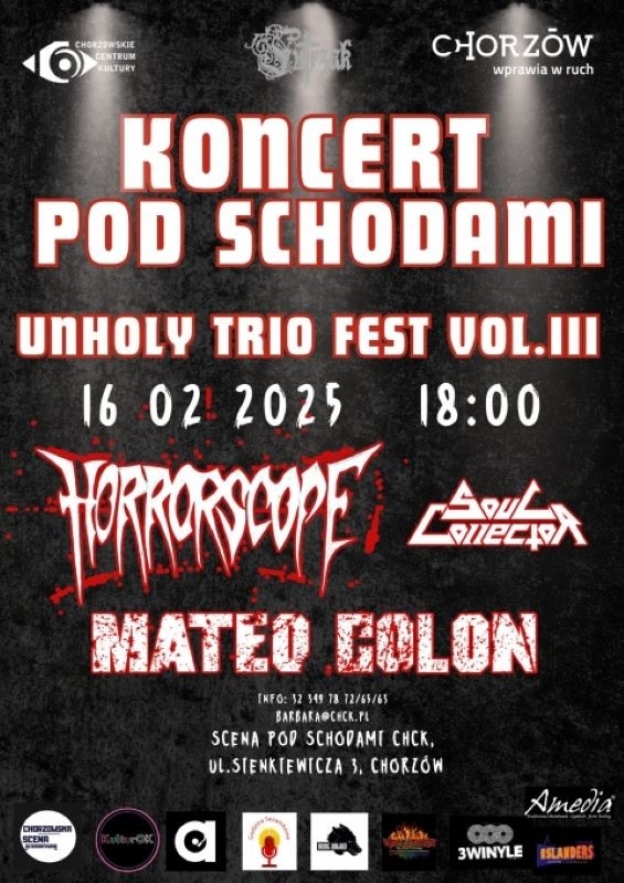 16 lutego o godzinie 18:00 na Chorzowskiej Scenie Alternatywnej w Scenie pod Schodami odbędzie się trzecia edycja Unholy Trio Fest. To coroczny festiwal organizowany przez Futrzaka, który przyciąga fanów ciężkiego brzmienia i mocnych emocji. Wydarzenie oferuje niezapomniane występy trzech wyjątkowych zespołów: Horrorscope, Mateo Colon oraz Soul Collector.