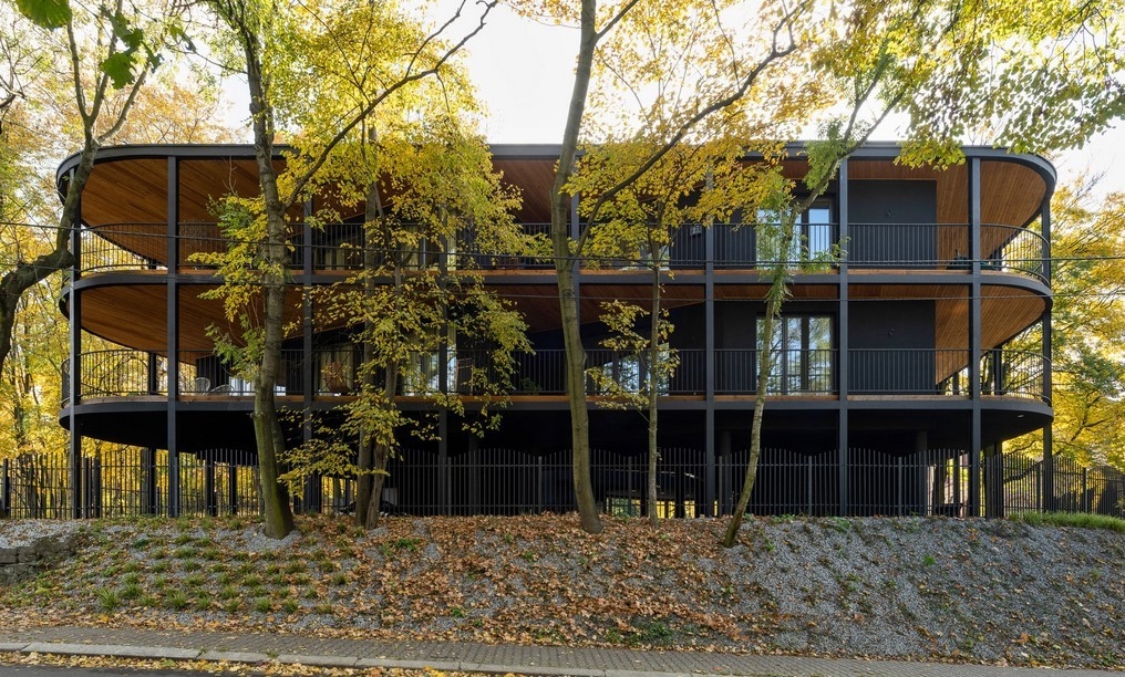 Blok otoczono balkonami, aby uzyskać panoramiczne otwarcie na otoczenie. Podczas formowania bryły budynku zdecydowano się na zaokrąglenie narożniki, nawiązując w ten sposób do charakteru międzywojennych willi w sąsiedztwie, koron drzew i otaczającej zieleni.