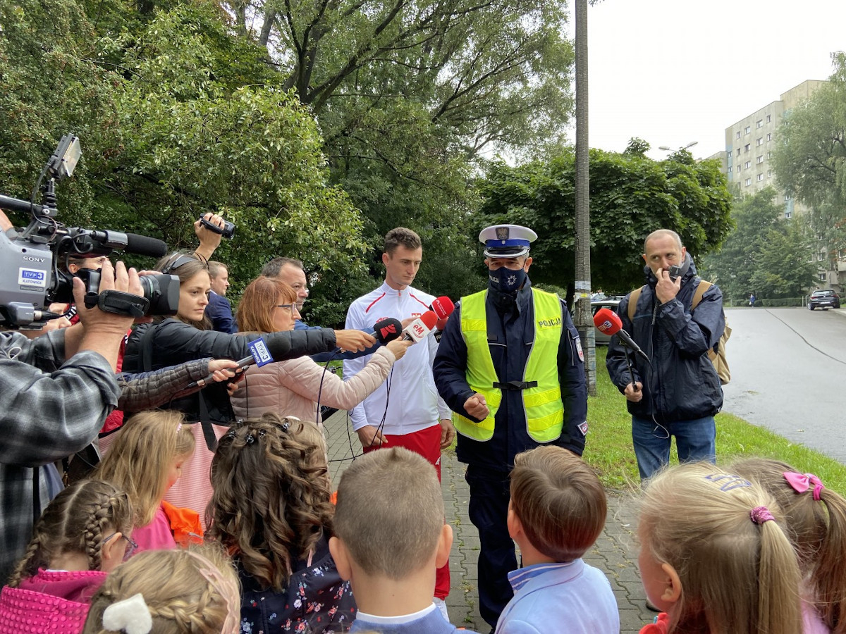 Dawid Tomala, który każdego dnia chodzi nawet po kilkadziesiąt kilometrów, nieraz musiał korzystać z dróg publicznych. Jak mało kto, wie jakie zagrożenie niesie za sobą nieuwaga w pobliżu ruchliwej drogi. To dlatego tak ważne jest zachowanie szczególnej ostrożności przechodząc przez pasy. Dziś mistrz olimpijski opowiadał o tym najmłodszym uczniom chorzowskiej SP nr 5. Najlepszy jest jednak dobry przykład, dlatego pierwszoklasiści trenowali przechodzenie przez przejście dla pieszych w praktyce - na najbliższej "zebrze".
