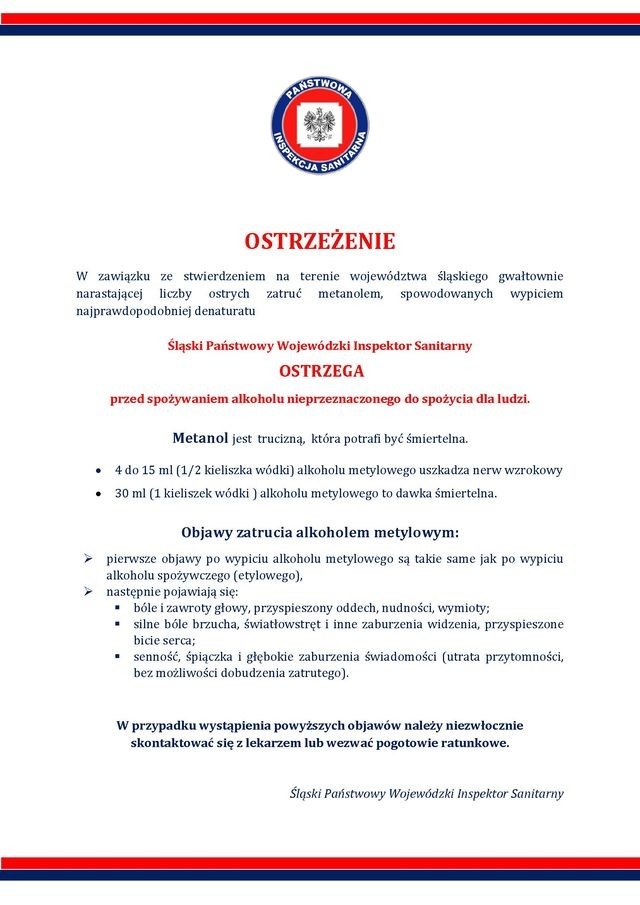 W sosnowieckim szpitalu jest leczona jeszcze jedna osoba po zatruciu alkoholem metylowym. Kolejna przebywa w Wojewódzkim Szpitalu Specjalistycznym im. Najświętszej Maryi Panny w Częstochowie.