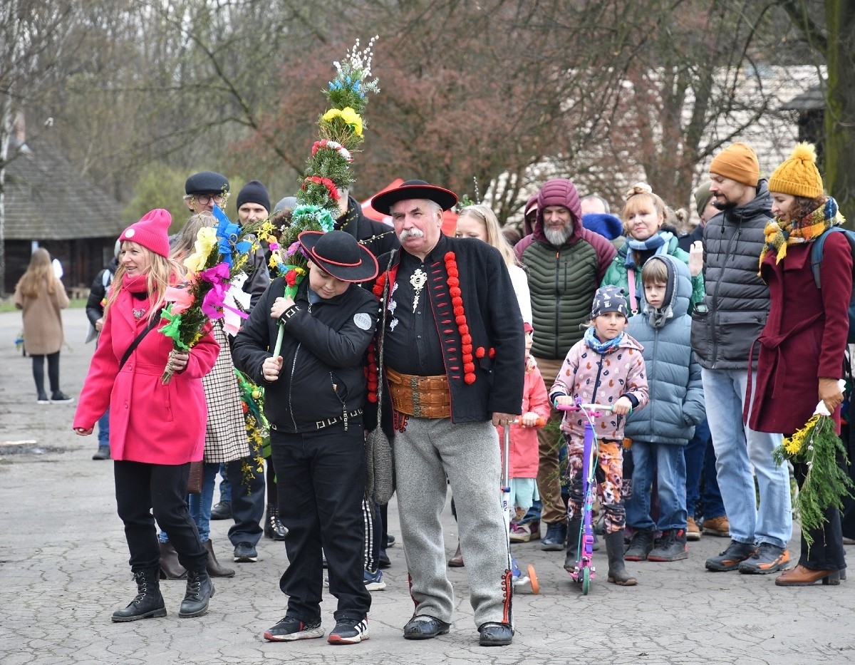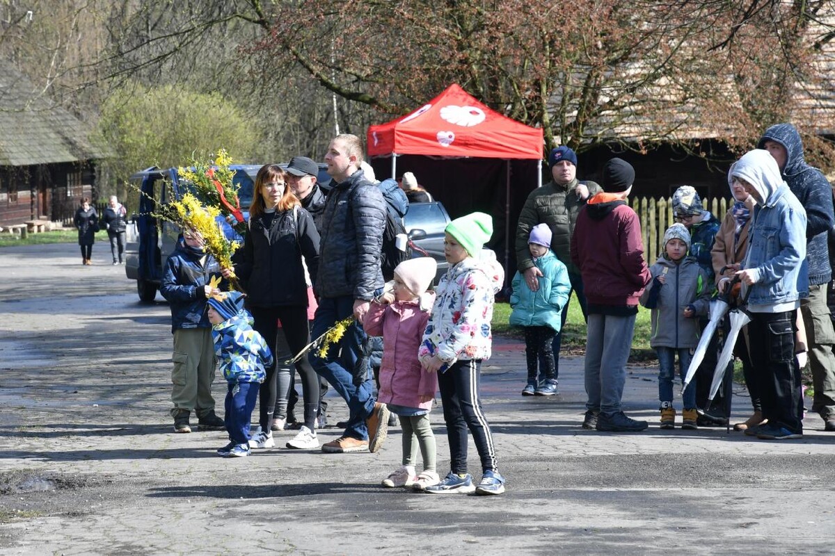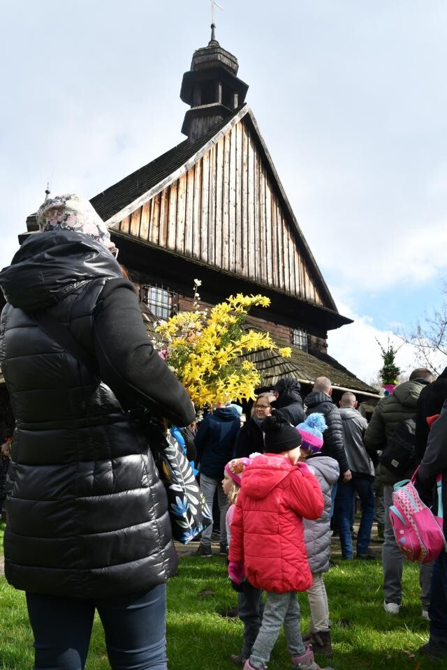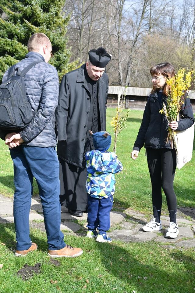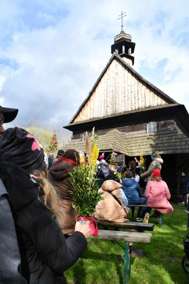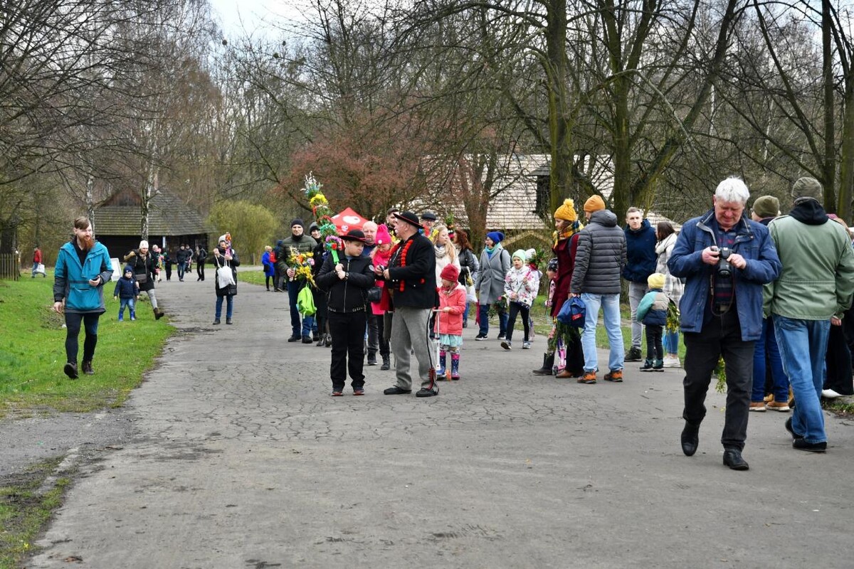 Po południu uczestnicy zgromadzili się na uroczystej mszy świętej z poświęceniem palm i wody. Po nabożeństwie wszyscy wzięli udział w barwnym korowodzie z palmami, który przeszedł przez teren skansenu, odtwarzając tradycje związane z Niedzielą Palmową i Wielkim Tygodniem. W trakcie korowodu opowiadano również o dawnych wierzeniach i rytuałach towarzyszących mieszkańcom dawnej wsi w okresie wielkanocnym.