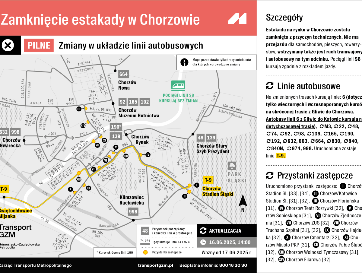 Od 17 czerwca zmieniono rozkłady jazdy 15 linii autobusowych: 22, 48, 74, 92, 98, 139, 165, 190, 632, 664, 830, 840, 840N, 974 i M3. Autobusy pojadą trasami, na których ruch aktualnie odbywa się płynniej. Dotyczy to m.in. M3 – trasa objazdowa będzie już krótsza, a liczba przystanków obsługiwanych w Chorzowie przez tę linię zmniejszy się z 9 do 4. Część zmian obejmie także linie 6, 663, 998 i T-9.