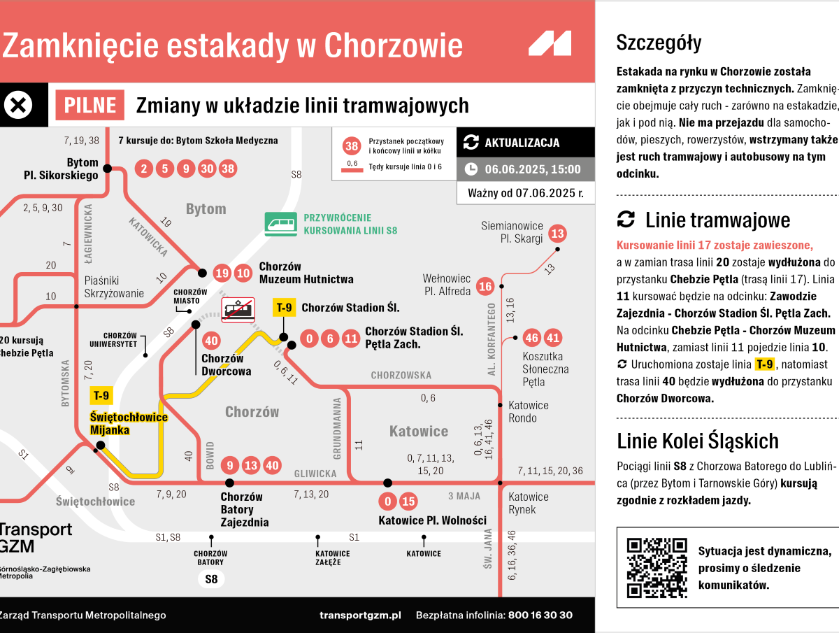 W związku z awaryjnym wyłączeniem przejazdu w rejonie Estakady wzdłuż ul. Katowickiej w Chorzowie obowiązywać będą zmiany w funkcjonowaniu komunikacji miejskiej.