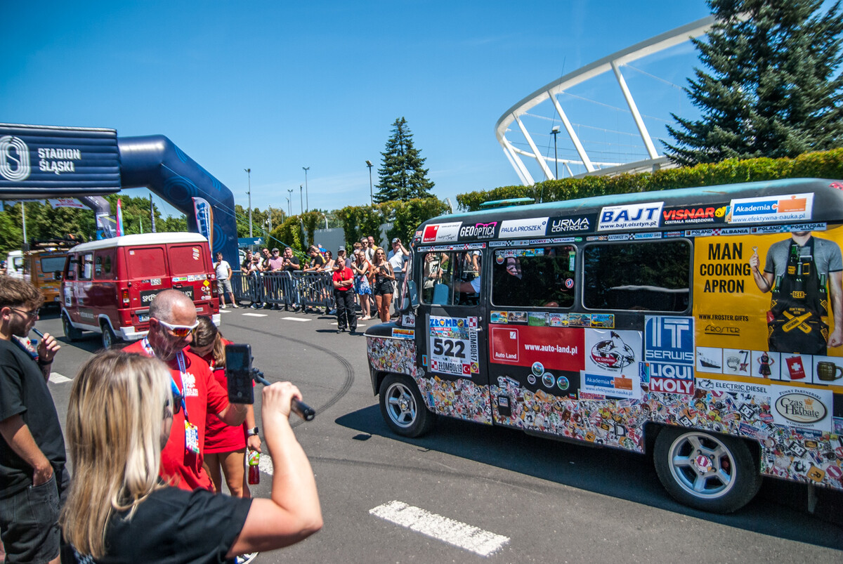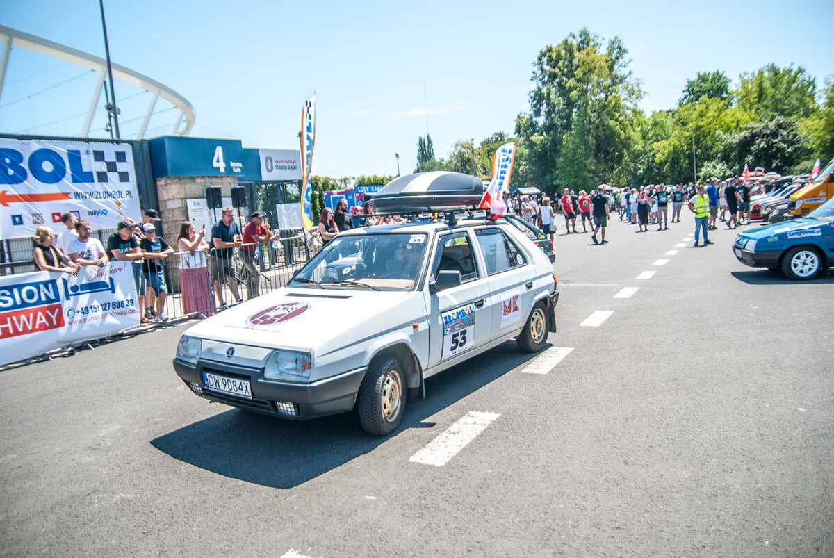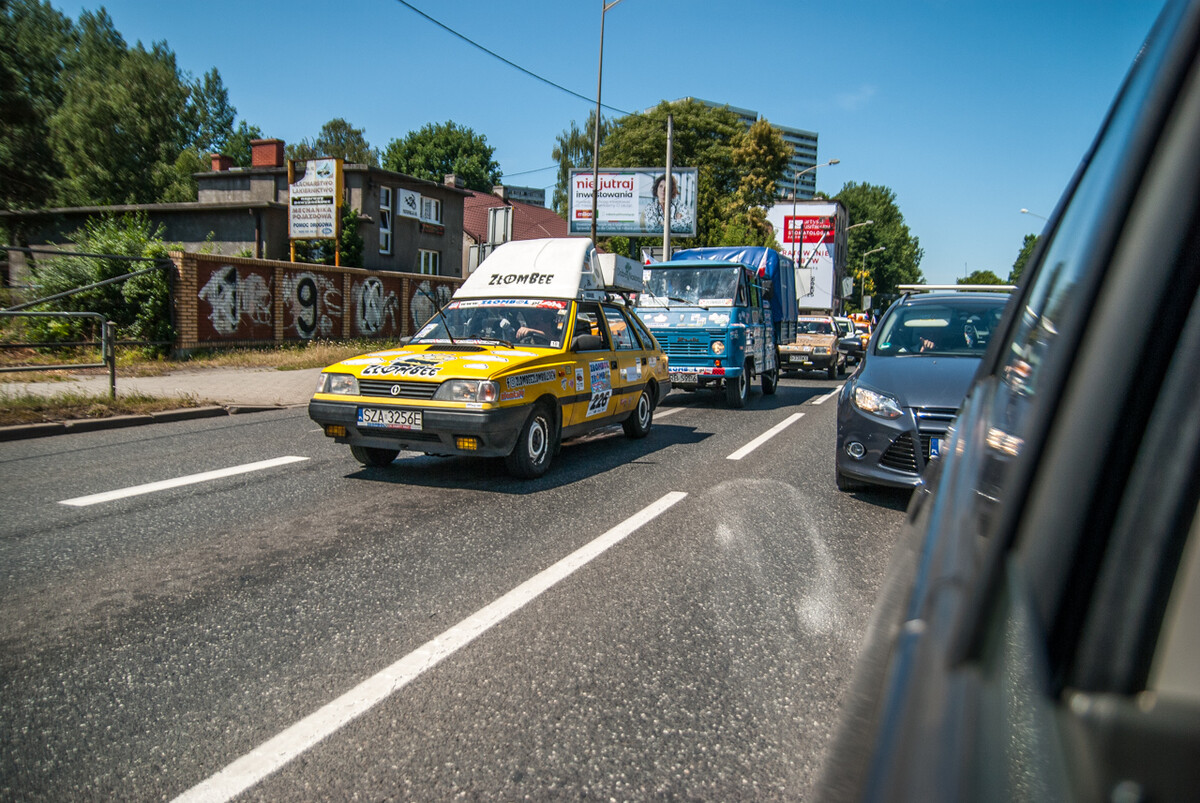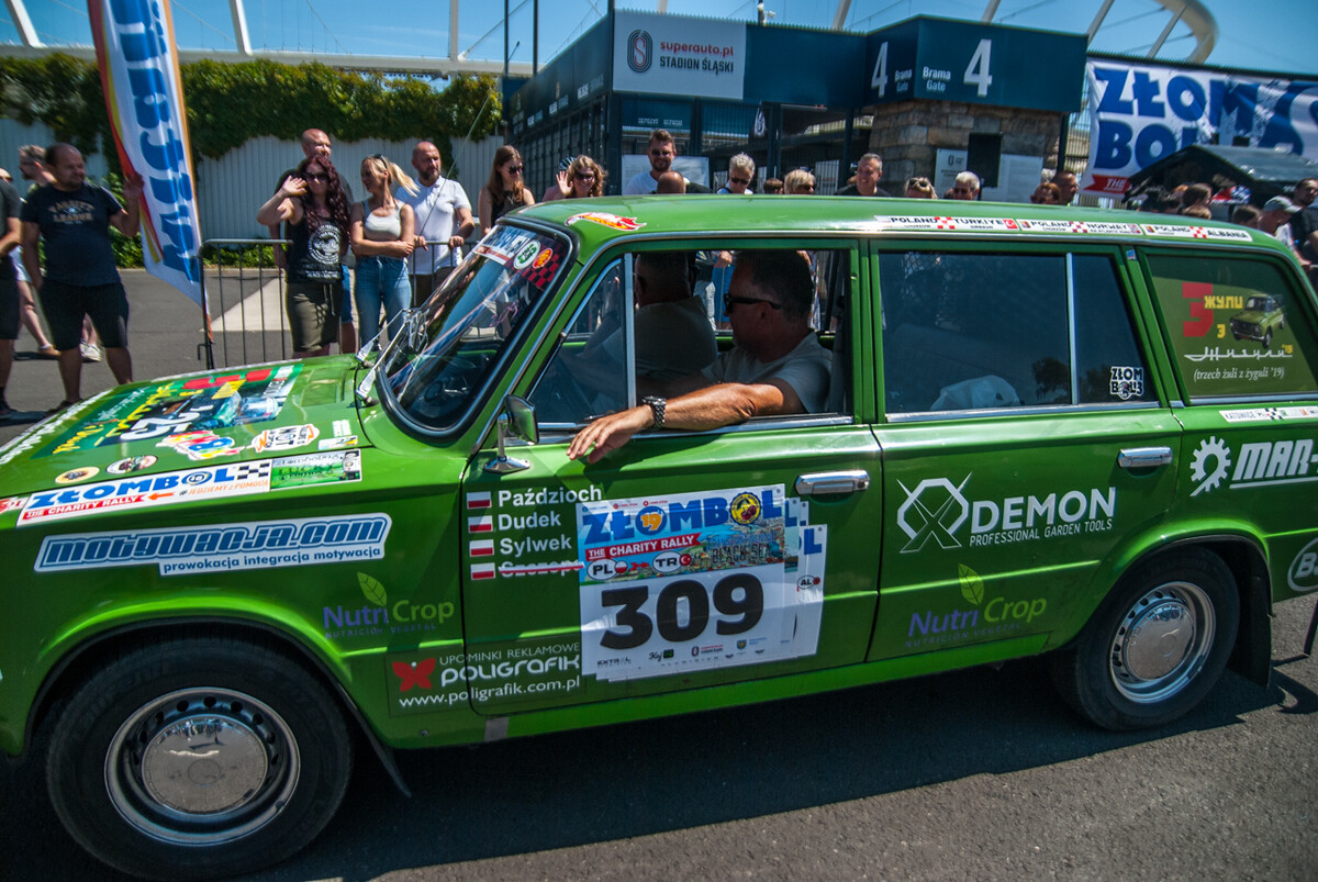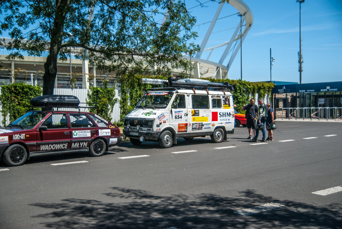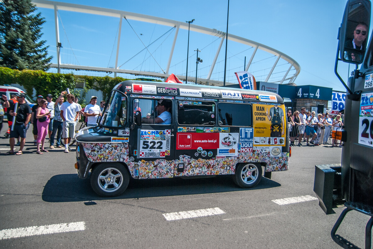 Równo o godzinie 12:00, gdy docieraliśmy powolutku pod Stadion Śląski, rozległa się głośna muzyka, kanonada klaksonów i 19 charytatywny rajd Złombol ruszył z kopyta. Wprawiono w ruch tysiące koni mechanicznych, w powietrze wzniósł się huk i zapach spalin.