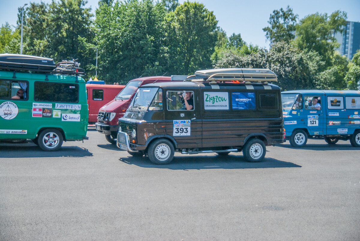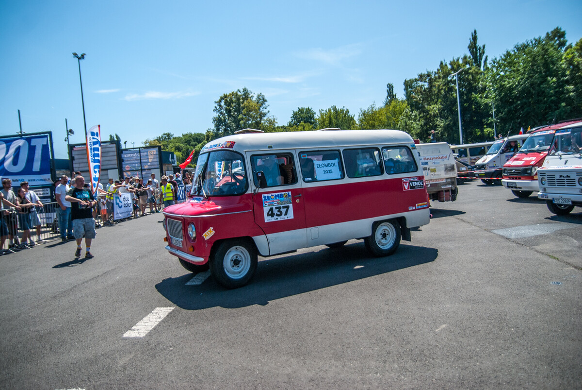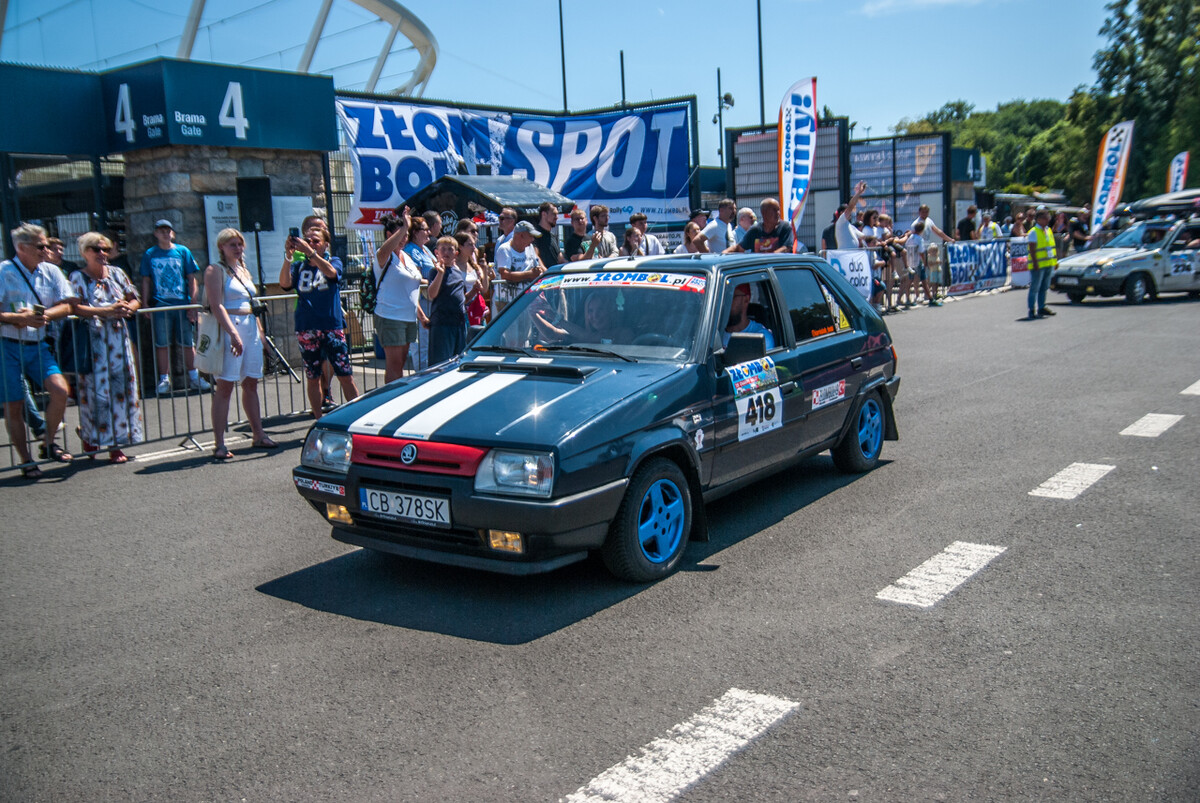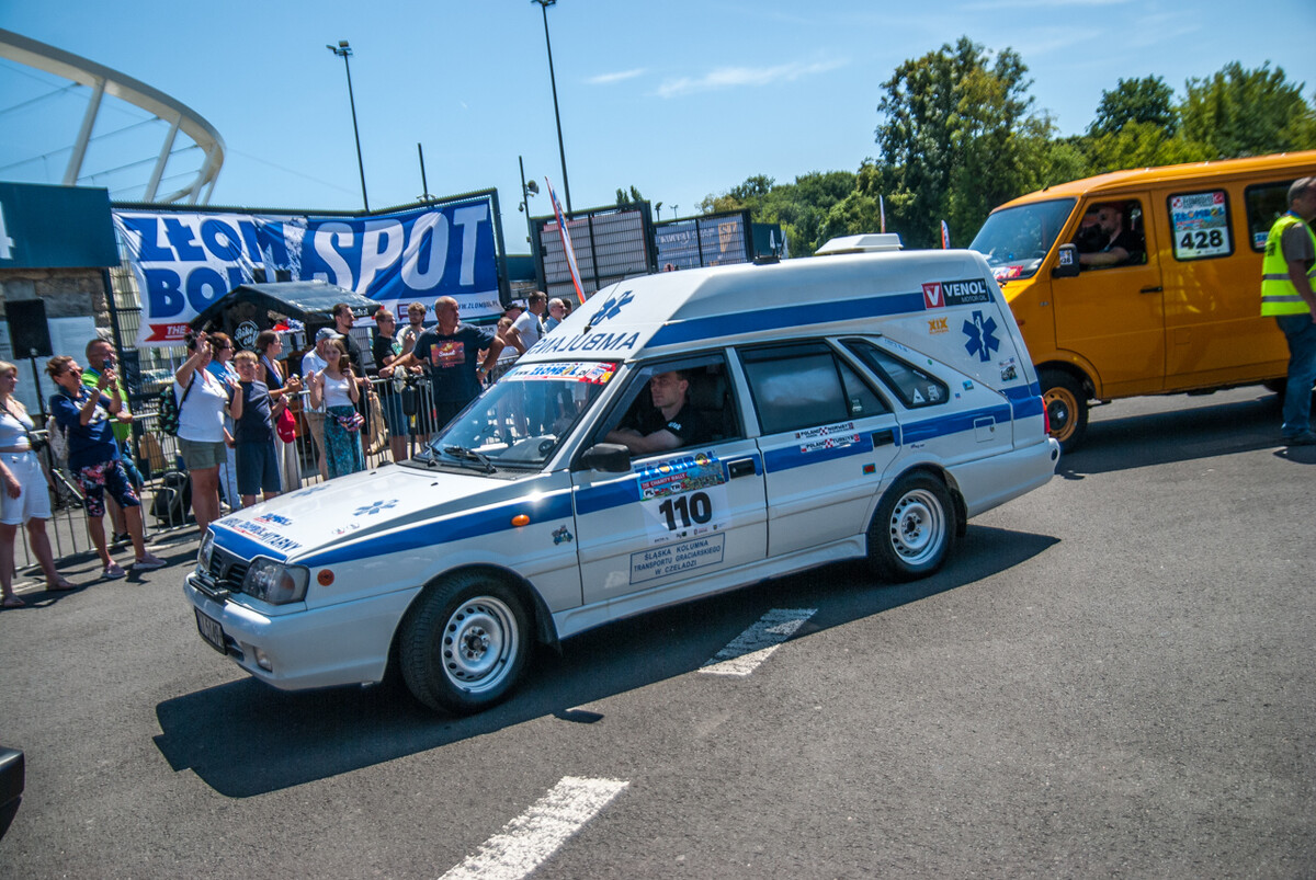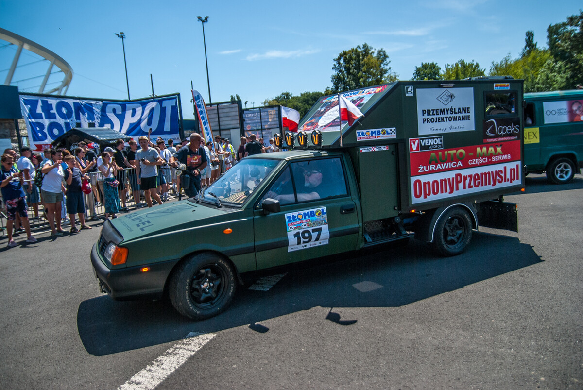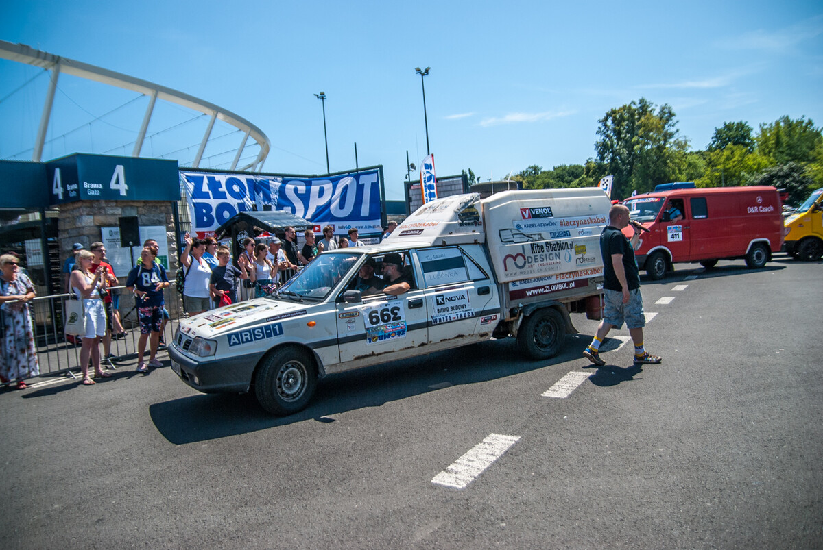 Równo o godzinie 12:00, gdy docieraliśmy powolutku pod Stadion Śląski, rozległa się głośna muzyka, kanonada klaksonów i 19 charytatywny rajd Złombol ruszył z kopyta. Wprawiono w ruch tysiące koni mechanicznych, w powietrze wzniósł się huk i zapach spalin.