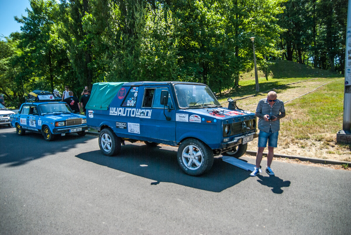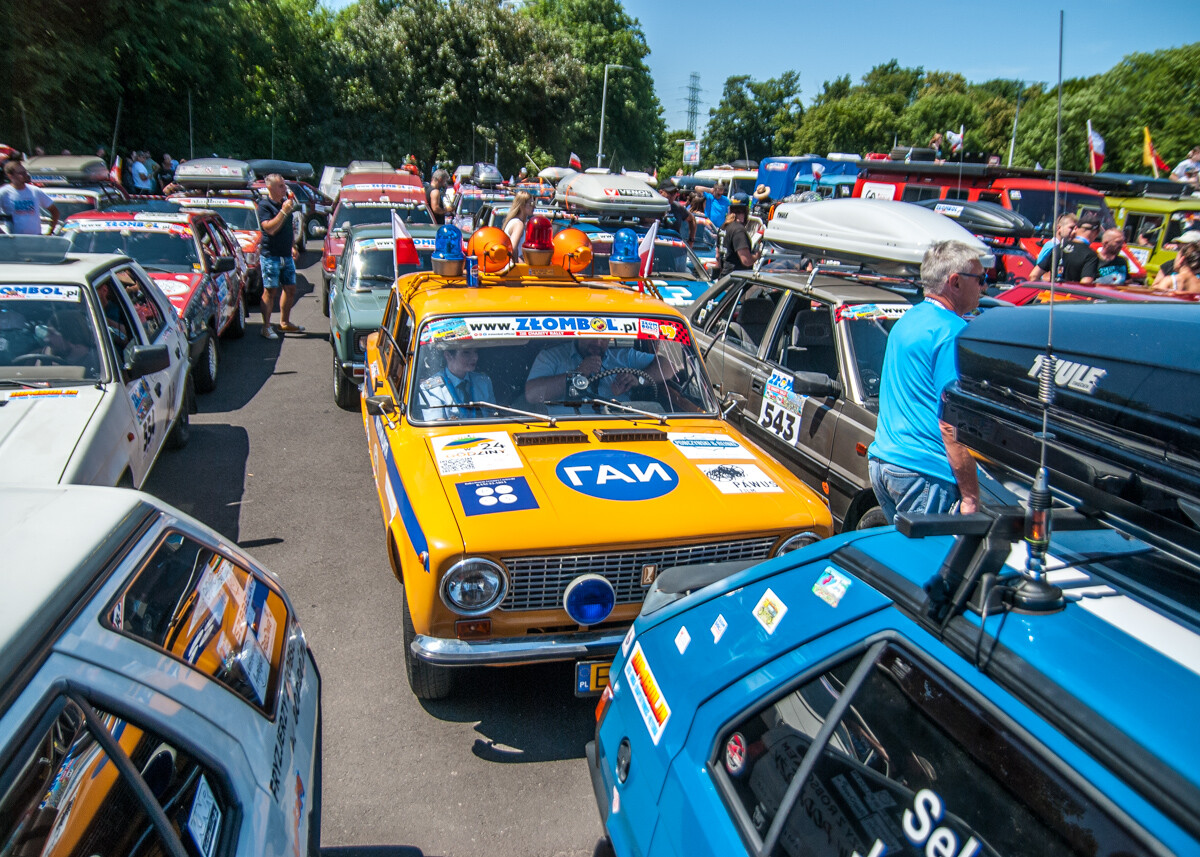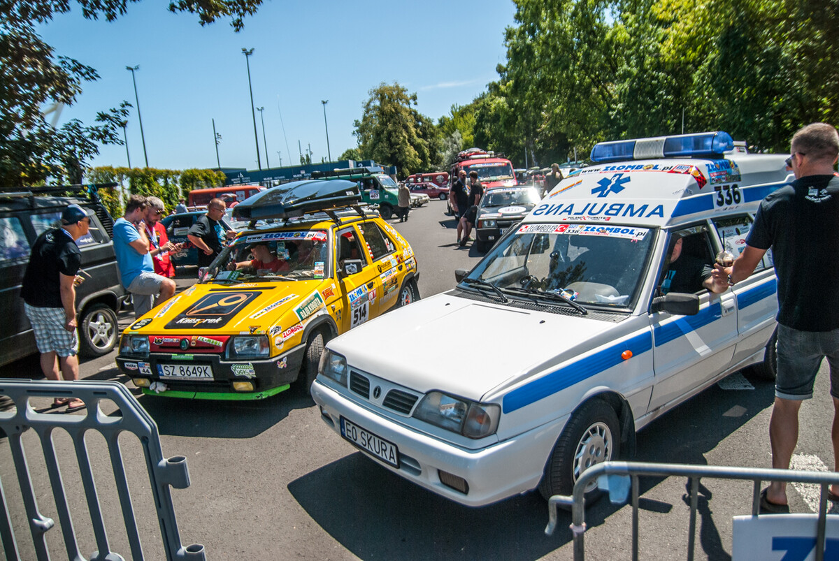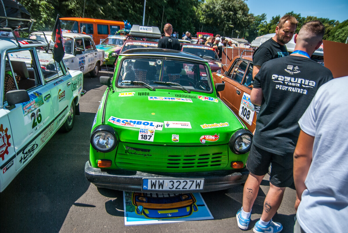 Ryk, warkot, klekot silników mieszał się z muzyką, okrzykami, pozdrowieniami setek widzów, a także wesołymi komentarzami prowadzącego imprezę. Na miejscu zastaliśmy morze Polonezów, Favoritek, leciwych Fiatów 125, Lublinków, nieco mniejsze ilości Żuków, Nysek i innych ciekawych pojazdów z tak zwanej minionej epoki. Furorę robiła terenowa “Buchanka”, Wartburg kombi, Polonez będący niegdyś samochodem pogrzebowym, a także Maluchy, pięknie odrestaurowany Trabant, ciekawa Skoda 105 i pewna wiekowa Łada, na której dachu zamontowano klimatyzację zdjętą z kampera.
