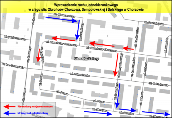 - ciągiem ul. Solskiego będzie obowiązywał ruch z kierunku ul. Obrońców Chorzowa w kierunku ul. Odrodzenia